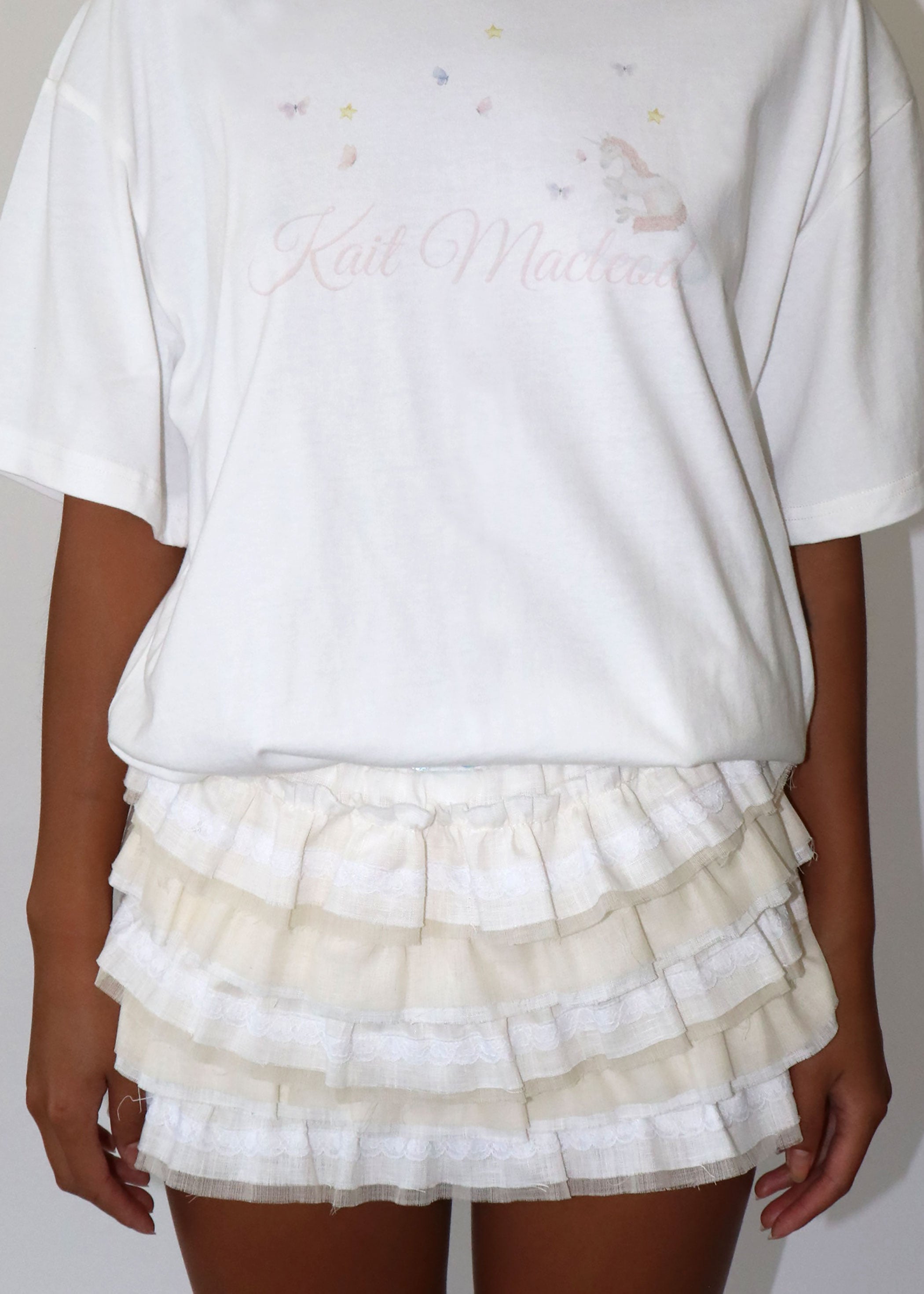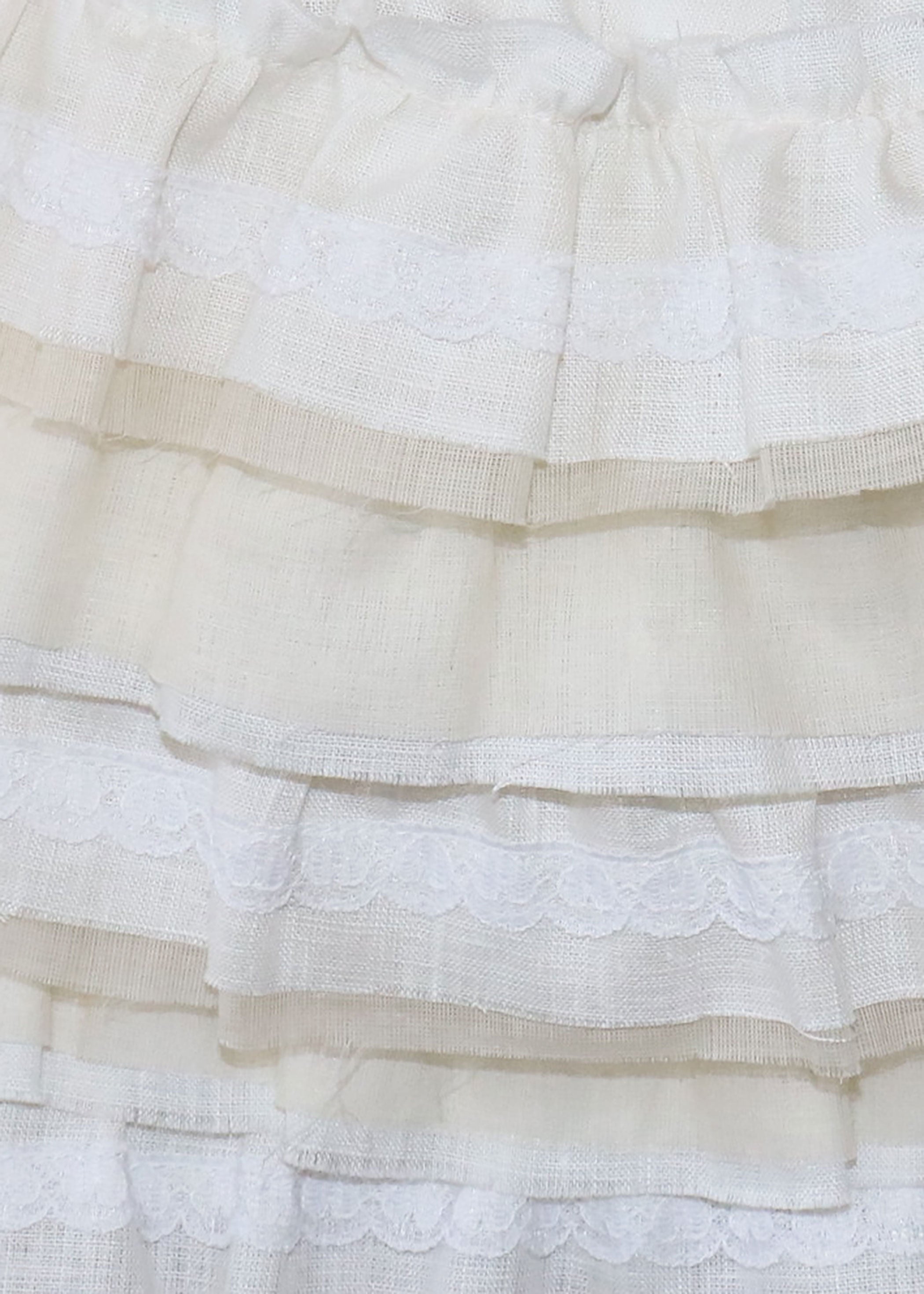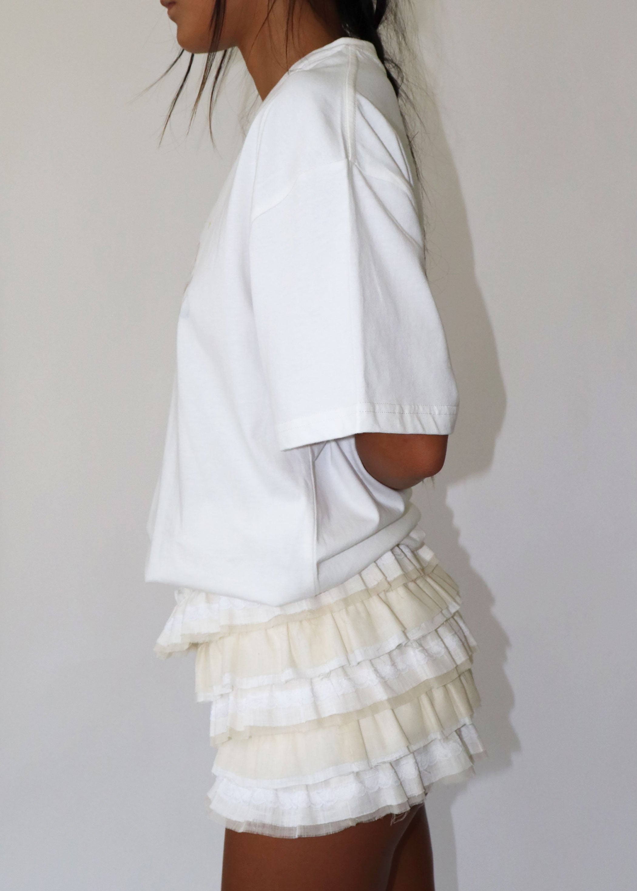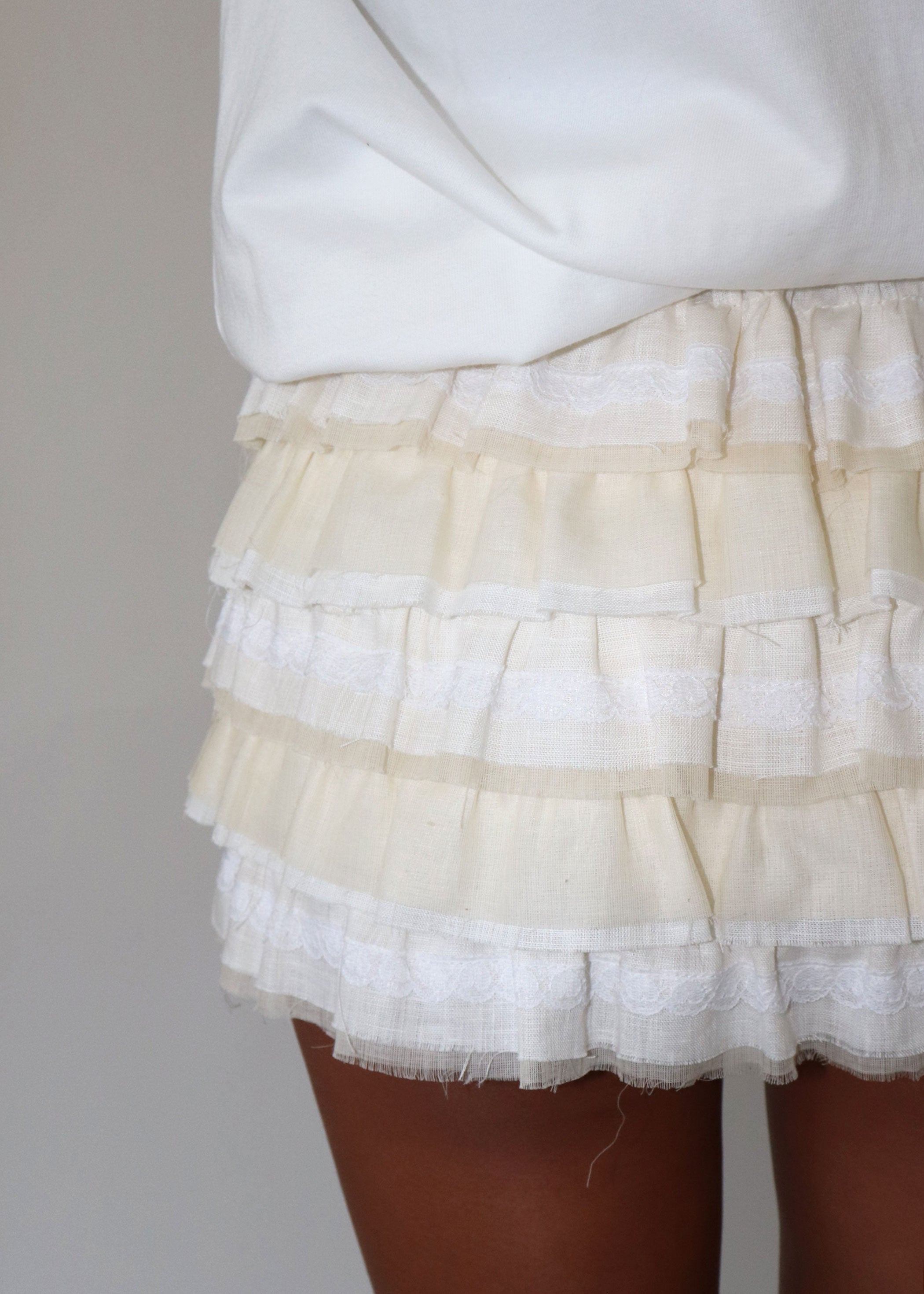 For the romantics. Delphine is soft and frilly with raw edge tiers of linen ruffles, and delicate lace. Her micro-mini length, makes her the perfect fit for any flirty occasion. For added charm, Delphine features lace trimmings detailed with small woven hearts and a tiny bow embellishment. Stretchy waist band & inner shorts for comfortable coverage.