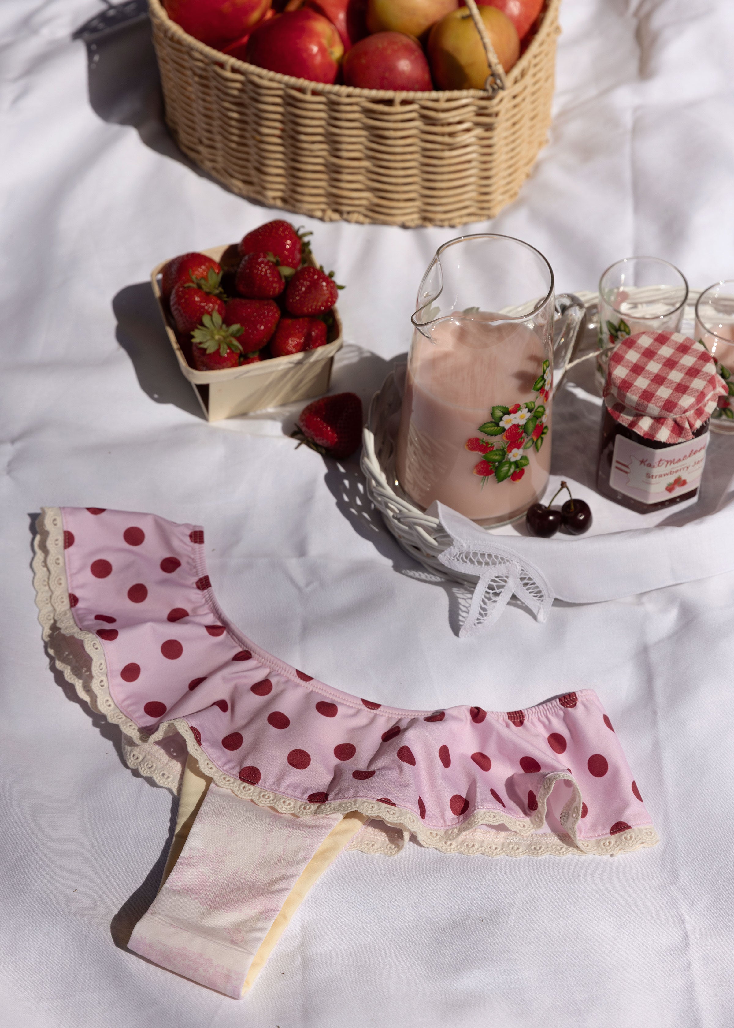 Flirt meets frill. Lady is an ultra-flattering bikini bottom featuring a polka dot ruffle skirt layered over a cheeky cut base in our signature summer toile—bunnies, butterflies, and bows included. Finished with a hem of heart-shaped lace trim, she’s designed to sit wherever you like: wear her low on the hips for a laid-back look or hike her up high for that leg-lengthening silhouette. It’s all in the details, and Lady knows it.