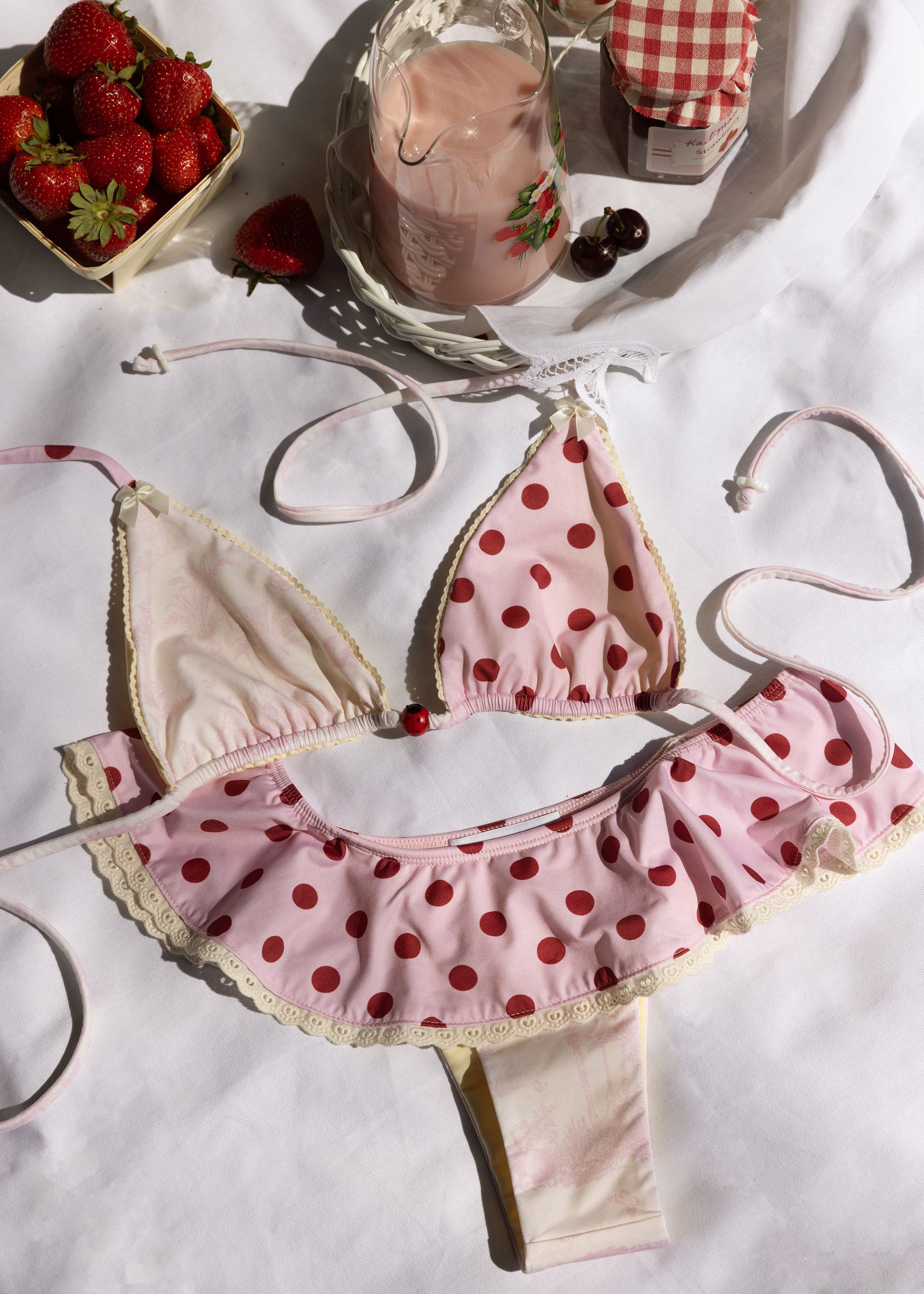 Cute as a bug! Lady is an ultra-flattering bikini top with a mismatched pairing of classic polkadot and our signature summer toile: featuring bunnies, butterflies, and bows. Designed for an ultimate lifting effect, her halter-style ties wrap at the neck and back to sculpt and support, finished with dainty loop trim and tiny bows. Each tie is tipped with a delicate, hand-blown glass daisy bead.