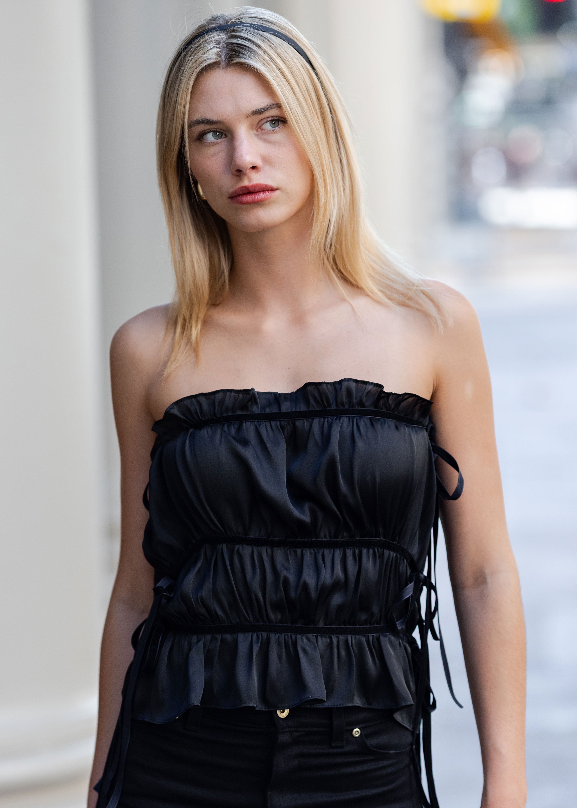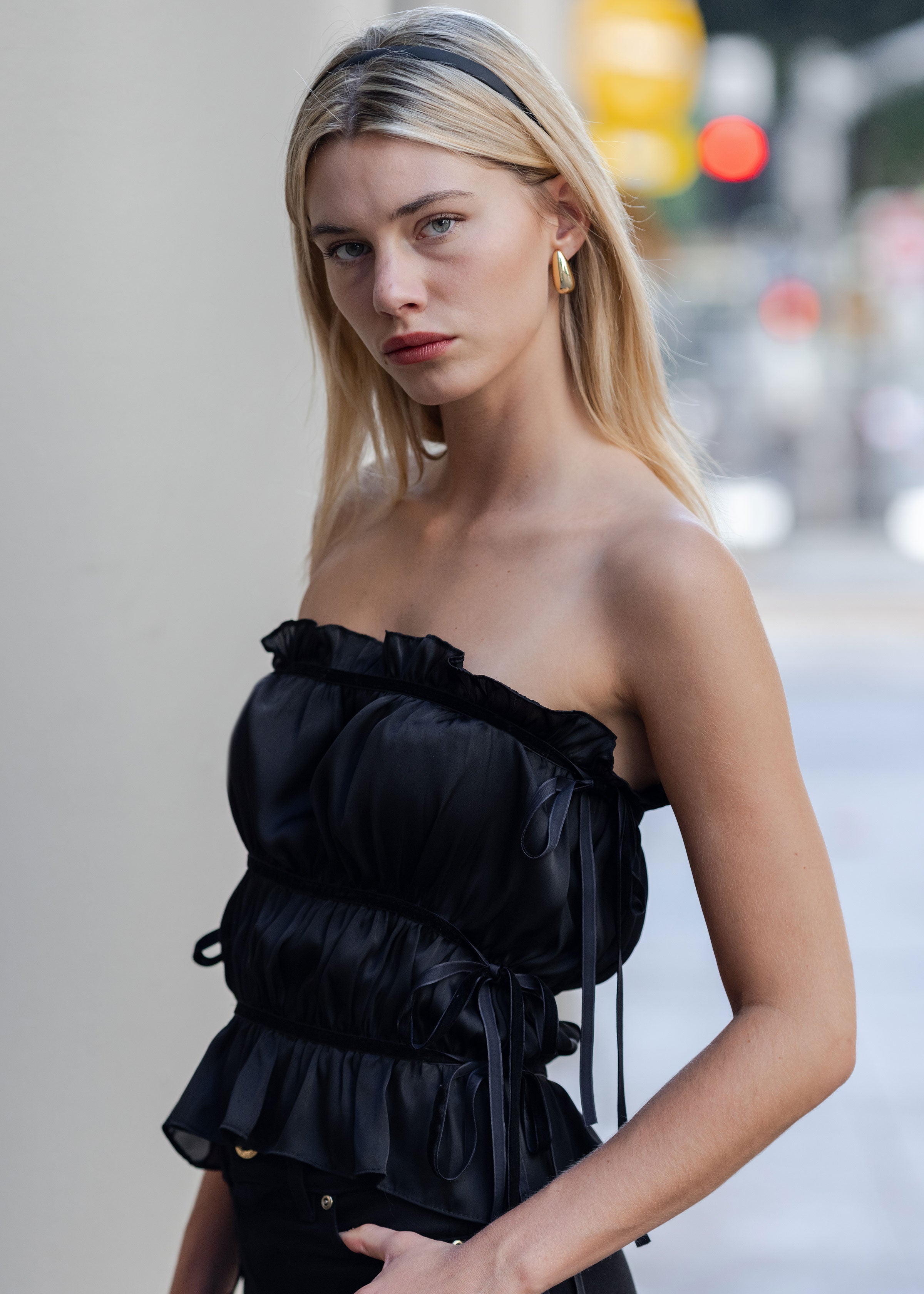 Searching for chic? Embrace pieces that build a sophisticated wardrobe. Lille can be effortlessly styled for every occasion. For an elegant fit, Lille is tailored with a no-slip interior trim at top, and hidden zipper with hook-and-eye closure on the back. The strapless silhouette is adorned by thin velvet bows that wrap across the bodice. Best paired with our Paris Denim Pant.
